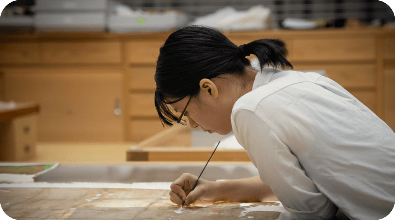 私たちの技術は日本の伝統的な装潢修理技術に基づいていますが、現代の修理にはこれに加えて、修理技術や用具、原材料などに対する科学分析や調査研究などを統合したアプローチが不可欠です。宰匠では最新の調査研究結果を積極的に取り入れ、伝統と科学の両輪によって、より安全性と再現性の高い修理技術の確立を追求しています。